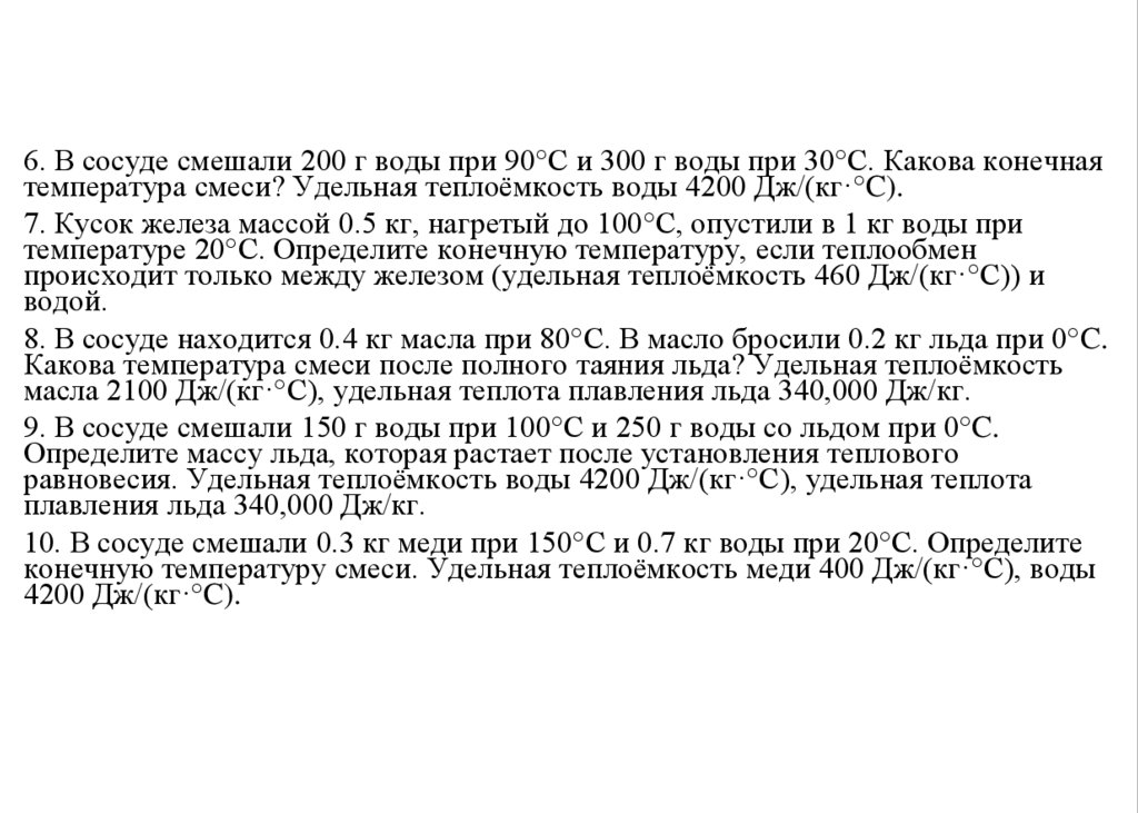 6. В сосуде смешали 200 г воды при 90°C и 300 г воды при 30°C. Какова конечнаятемпература смеси? Удельная теплоёмкость воды 4200 Дж/(кг·°C).