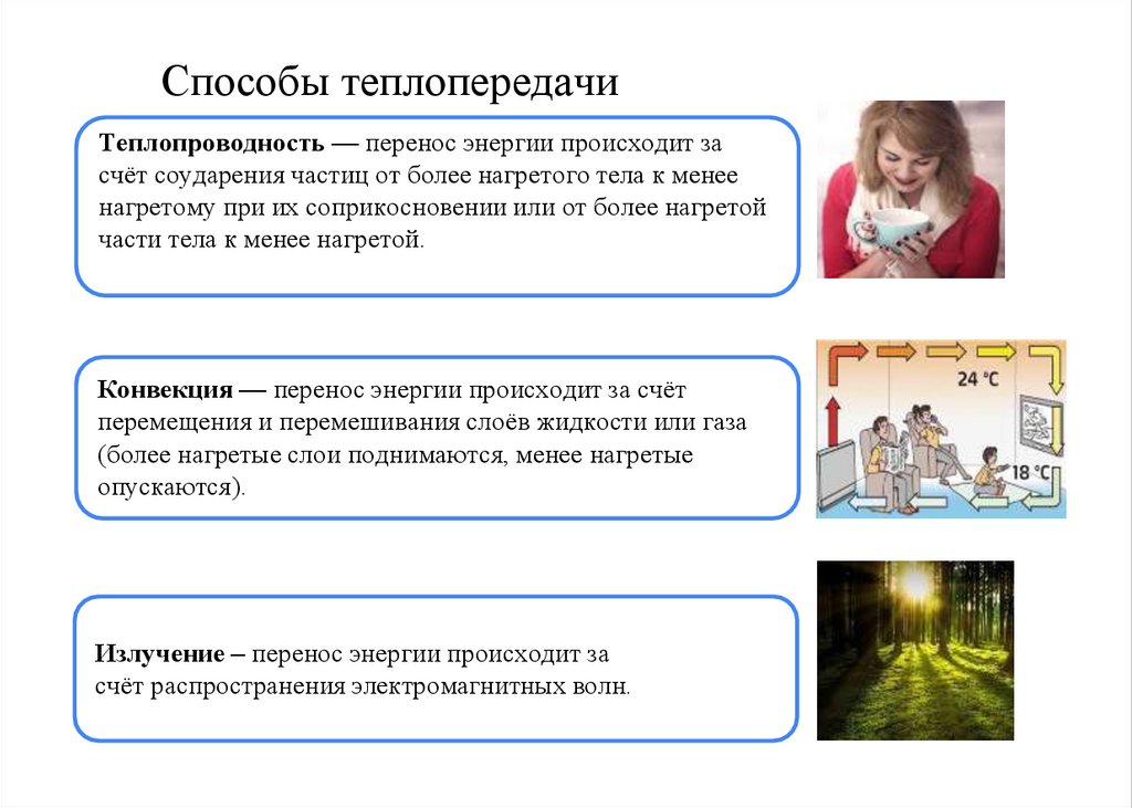 Способы теплопередачиТеплопроводность — перенос энергии происходит за