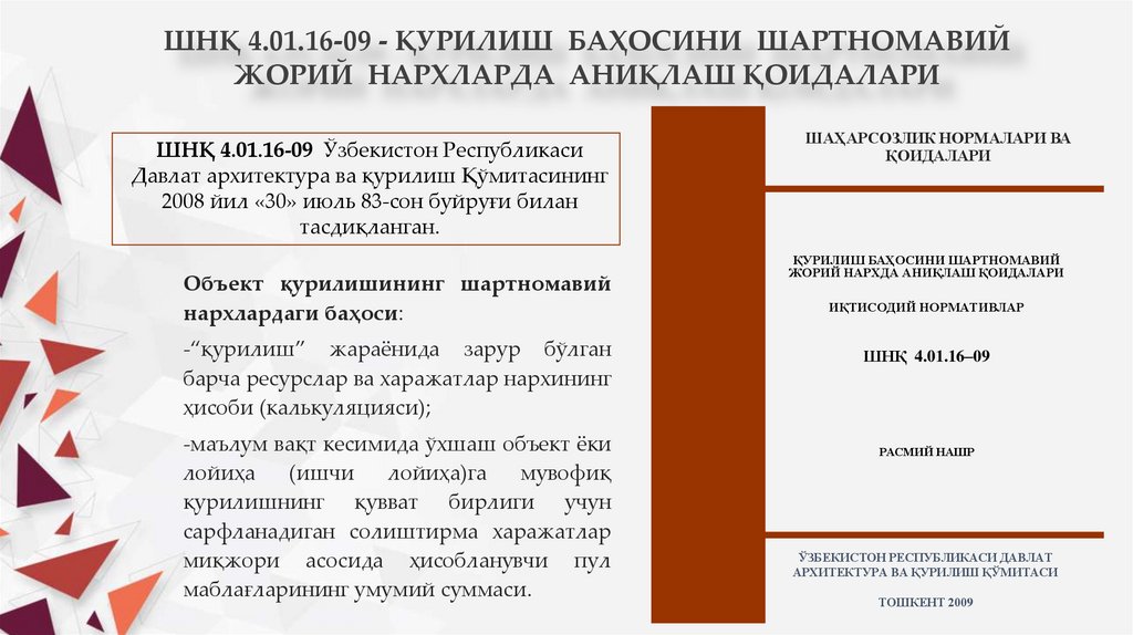 ШНҚ 4.01.16-09 - ҚУРИЛИШ БАҲОСИНИ ШАРТНОМАВИЙЖОРИЙ НАРХЛАРДА АНИҚЛАШ ҚОИДАЛАРИ