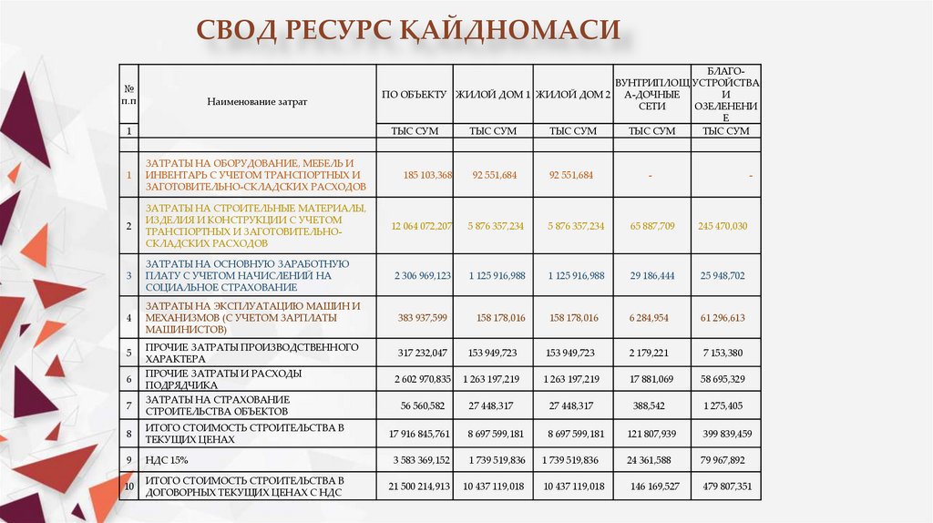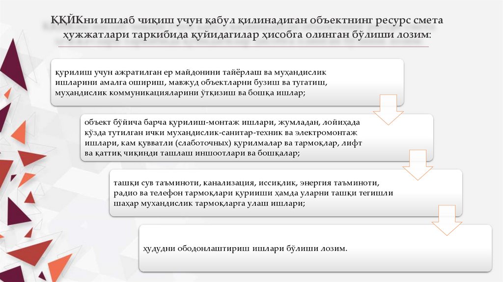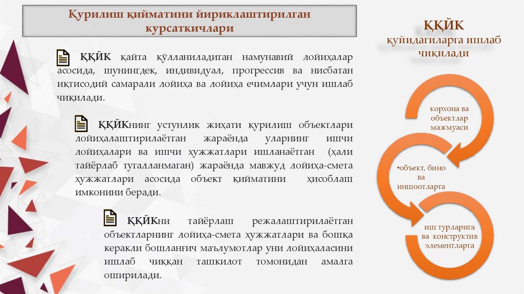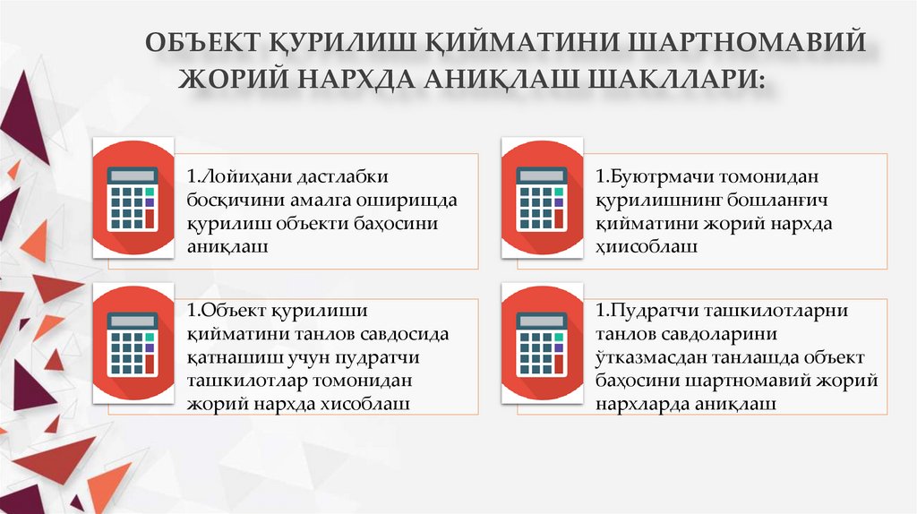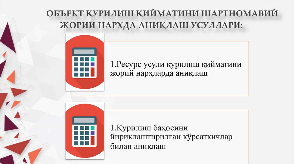 ОБЪЕКТ ҚУРИЛИШ ҚИЙМАТИНИ ШАРТНОМАВИЙЖОРИЙ НАРХДА АНИҚЛАШ УСУЛЛАРИ: