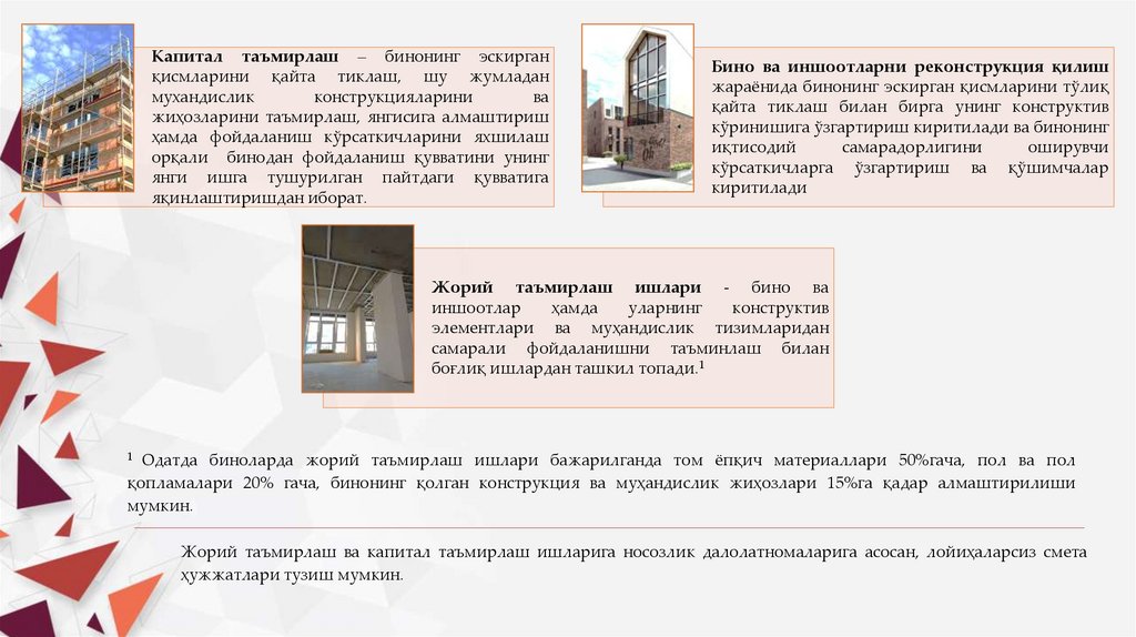 Капитал таъмирлаш – бинонинг эскирганқисмларини қайта тиклаш, шу жумладан