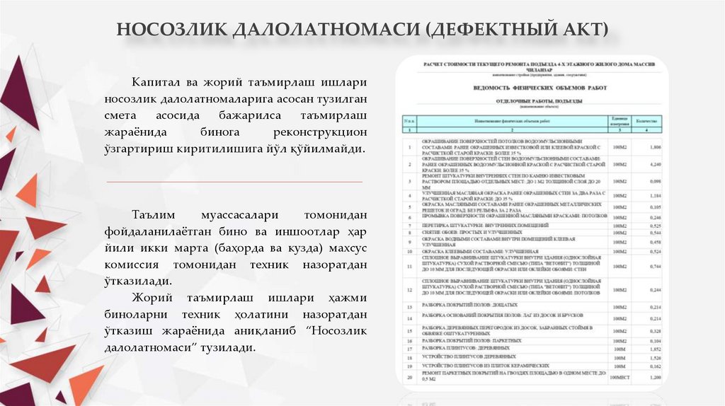 НОСОЗЛИК ДАЛОЛАТНОМАСИ (ДЕФЕКТНЫЙ АКТ)Капитал ва жорий таъмирлаш ишлари