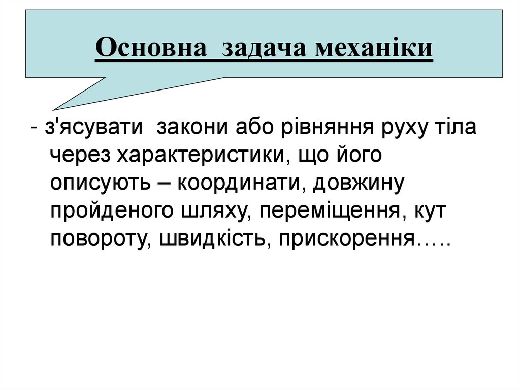 Основна задача механіки- з'ясувати закони або рівняння руху тіла