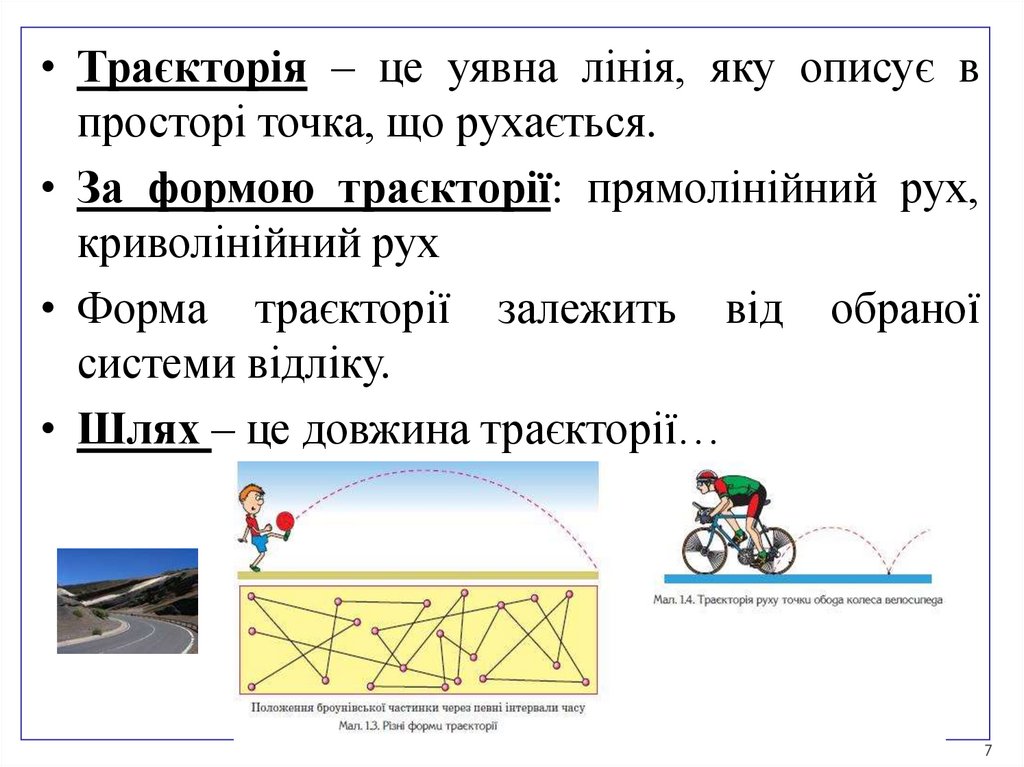 • Траєкторія – це уявна лінія, яку описує впросторі точка, що рухається.