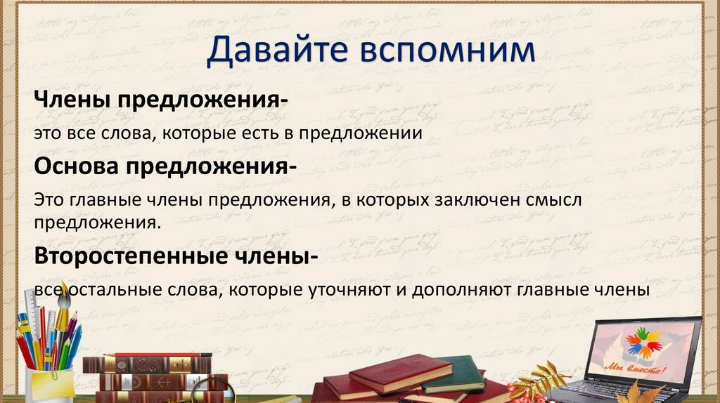 Давайте вспомнимЧлены предложенияэто все слова, которые есть в предложении