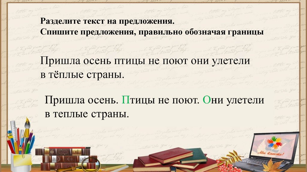 Разделите текст на предложения.Спишите предложения, правильно обозначая границы