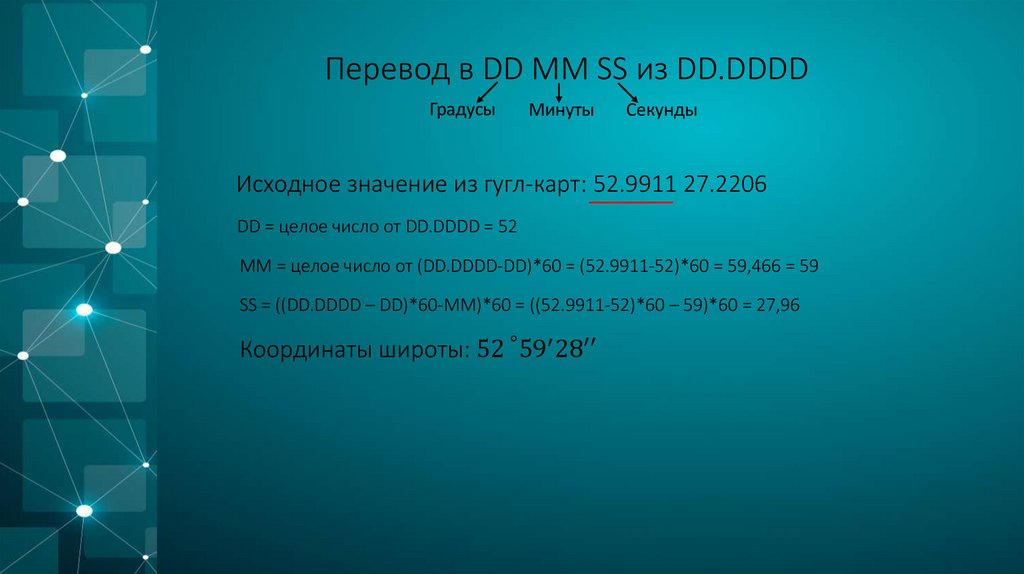 MM = целое число от (DD.DDDD-DD)*60 = (52.9911-52)*60 = 59,466 = 59