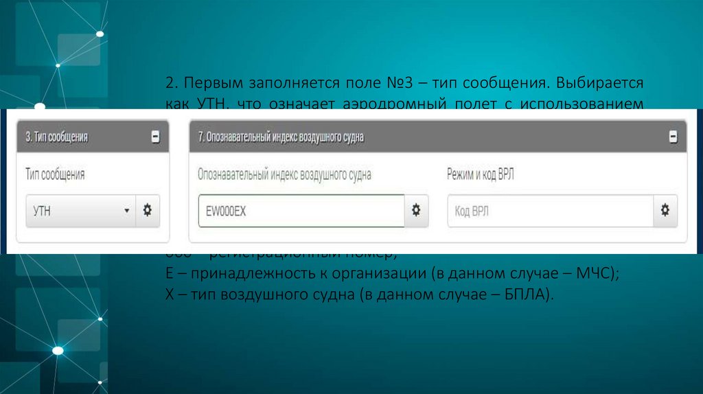 2. Первым заполняется поле №3 – тип сообщения. Выбираетсякак УТН, что означает аэродромный полет с использованием