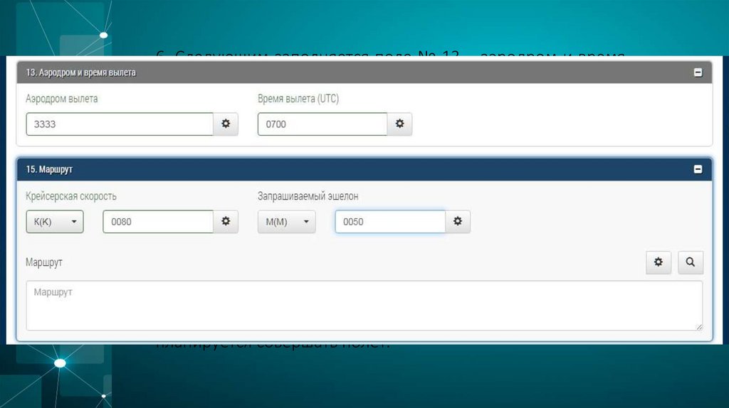 6. Следующим заполняется поле № 13 – аэродром и времявылета. В окне «аэродром вылета» кириллицей вводятся 4
