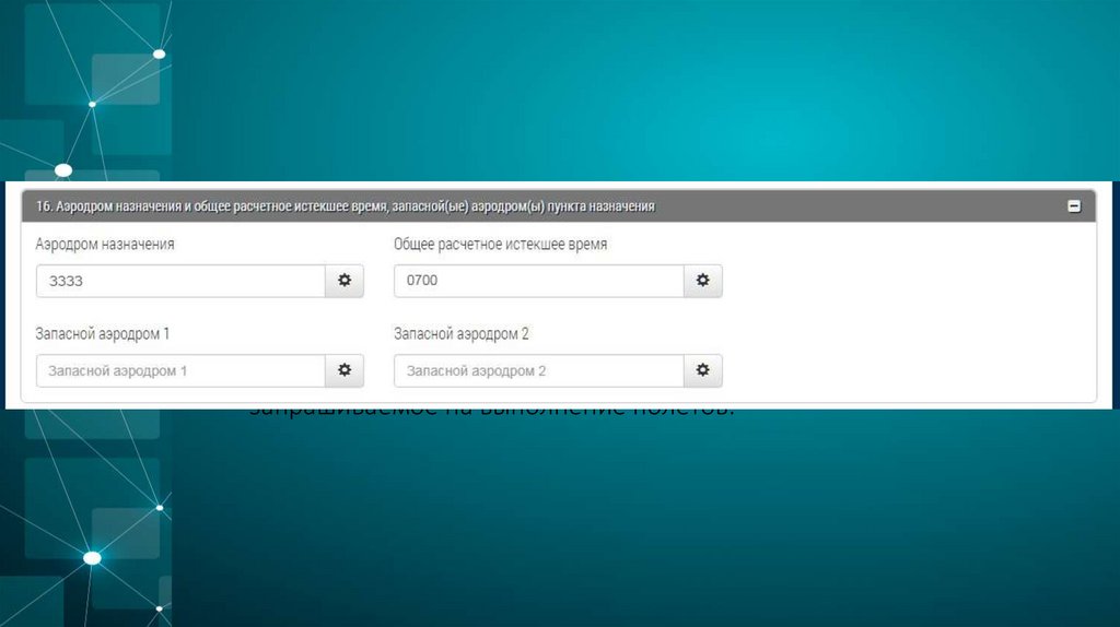 8. Далее заполняется поле № 16 – аэродром назначения и общеерасчетное истекшее время, запасной аэродром(ы). В данном поле