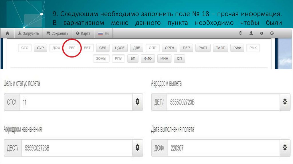 9. Следующим необходимо заполнить поле № 18 – прочая информация.В вариативном меню данного пункта необходимо чтобы были