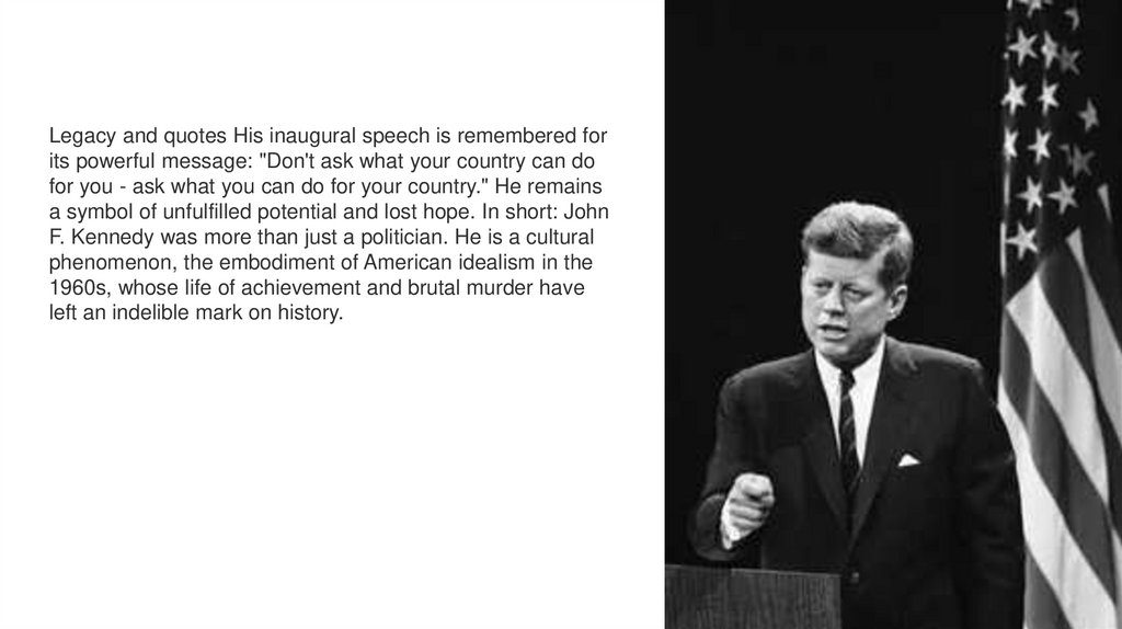 Legacy and quotes His inaugural speech is remembered forits powerful message: "Don't ask what your country can do