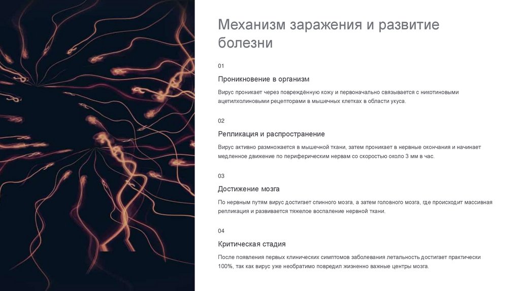 По нервным путям вирус достигает спинного мозга, а затем головного мозга, где происходит массивная