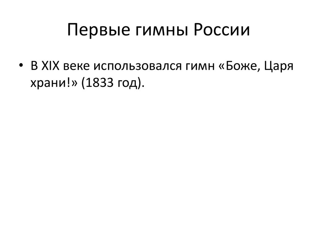 Первые гимны России• В XIX веке использовался гимн «Боже, Царя
