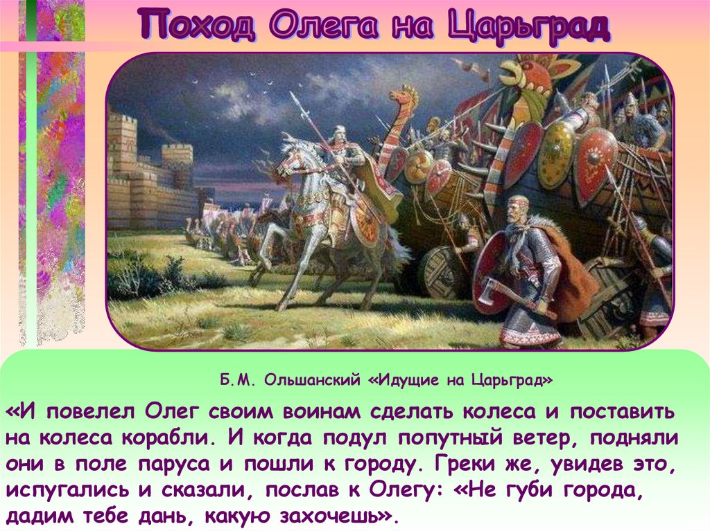 Б.М. Ольшанский «Идущие на Царьград»«И повелел Олег своим воинам сделать колеса и поставить