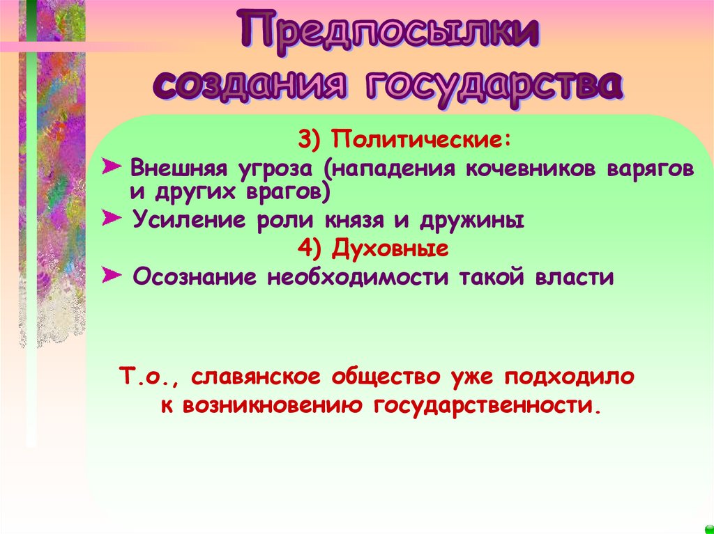 3) Политические:Внешняя угроза (нападения кочевников варягов