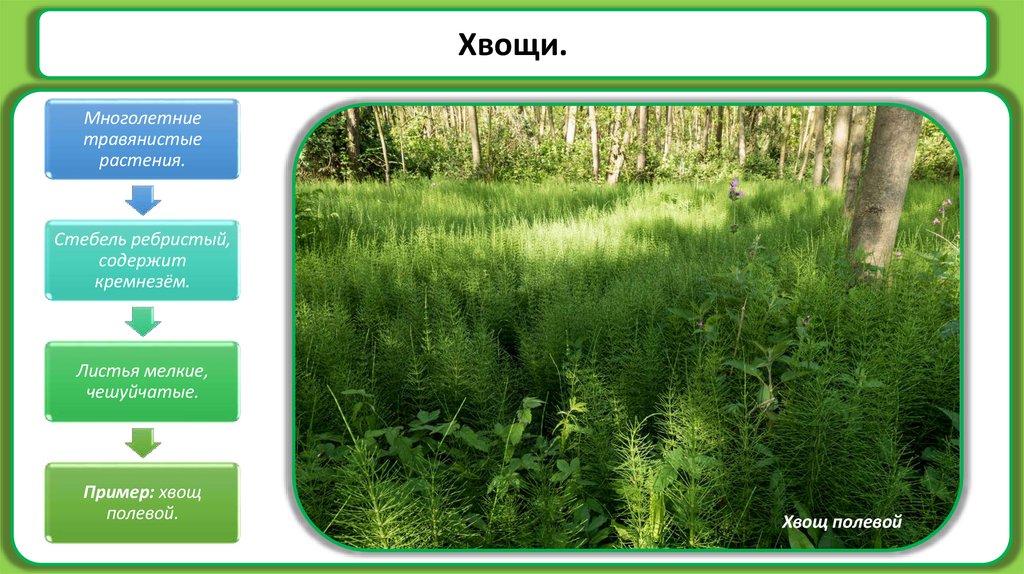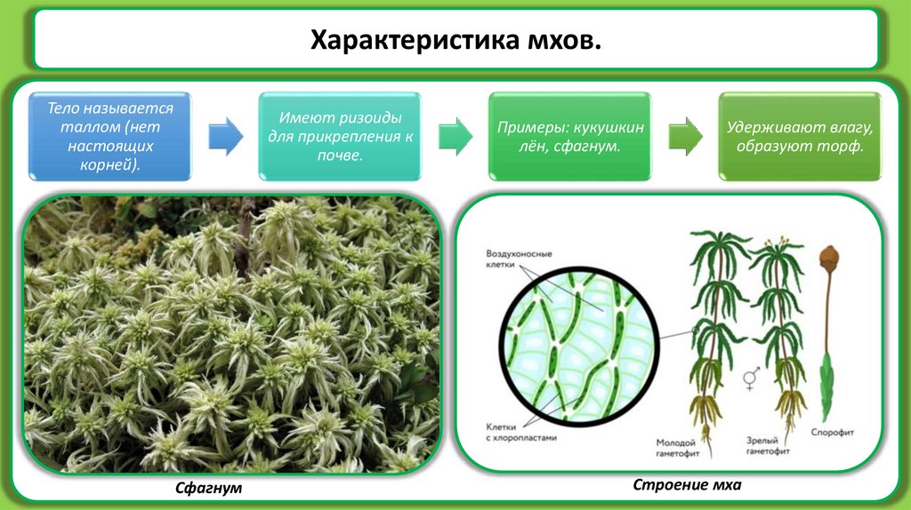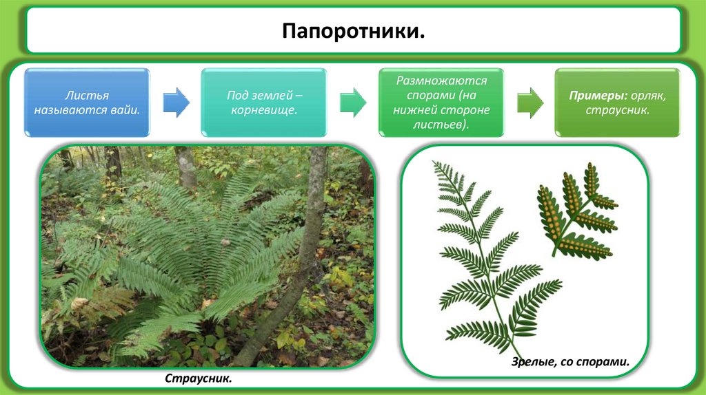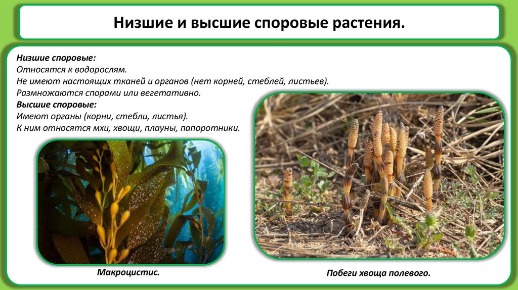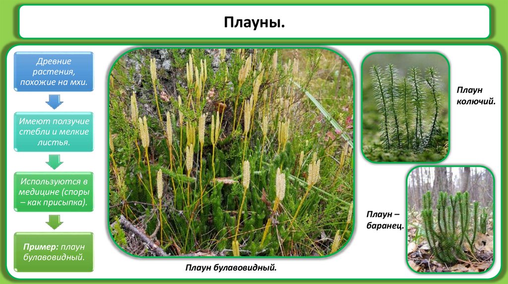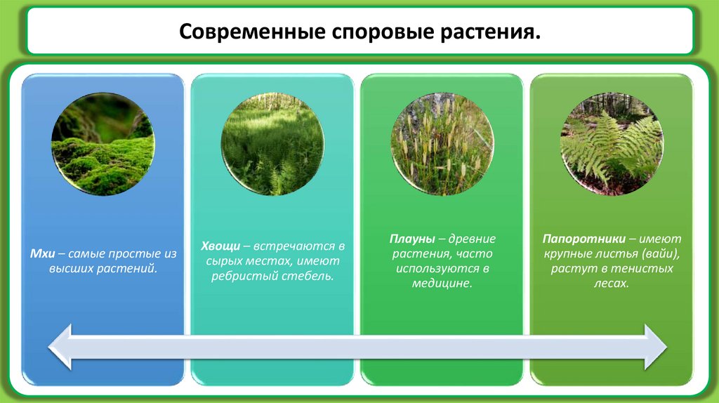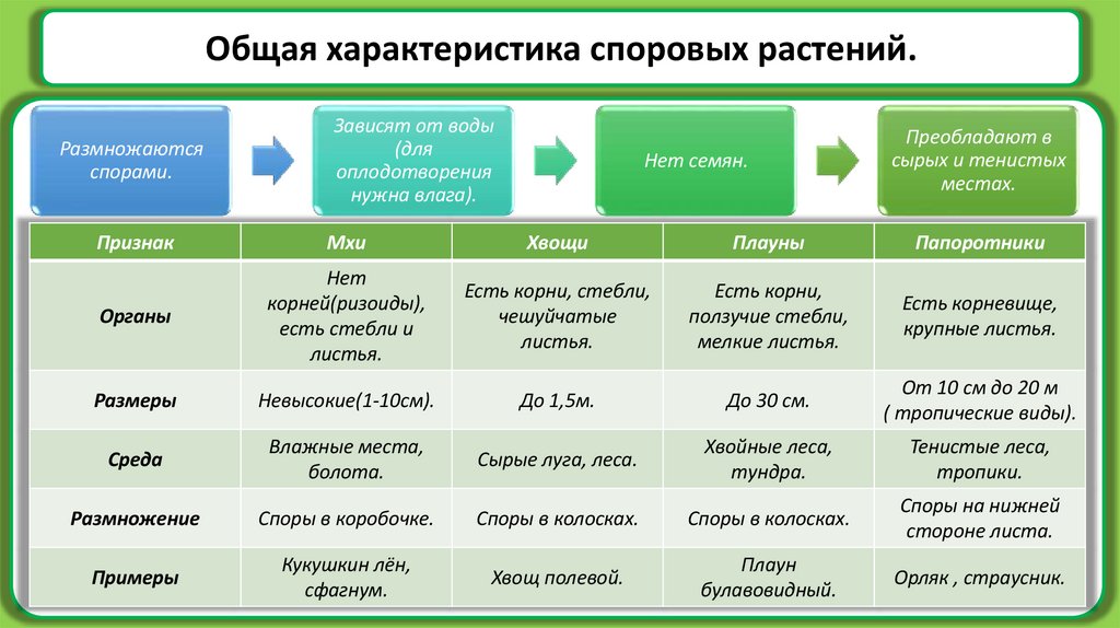 К ним относятся мхи, хвощи, плауны, папоротники.