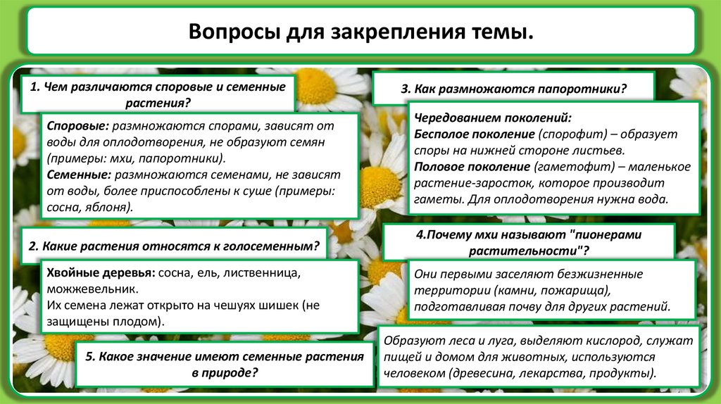 Вопросы для закрепления темы.1. Чем различаются споровые и семенные