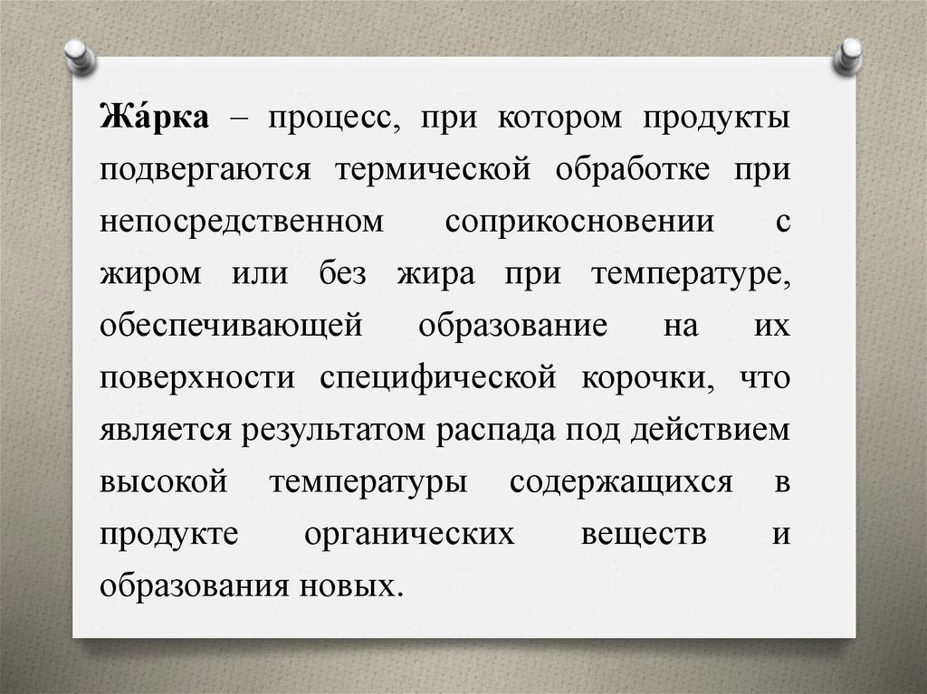 Жа́рка – процесс, при котором продуктыподвергаются термической обработке при