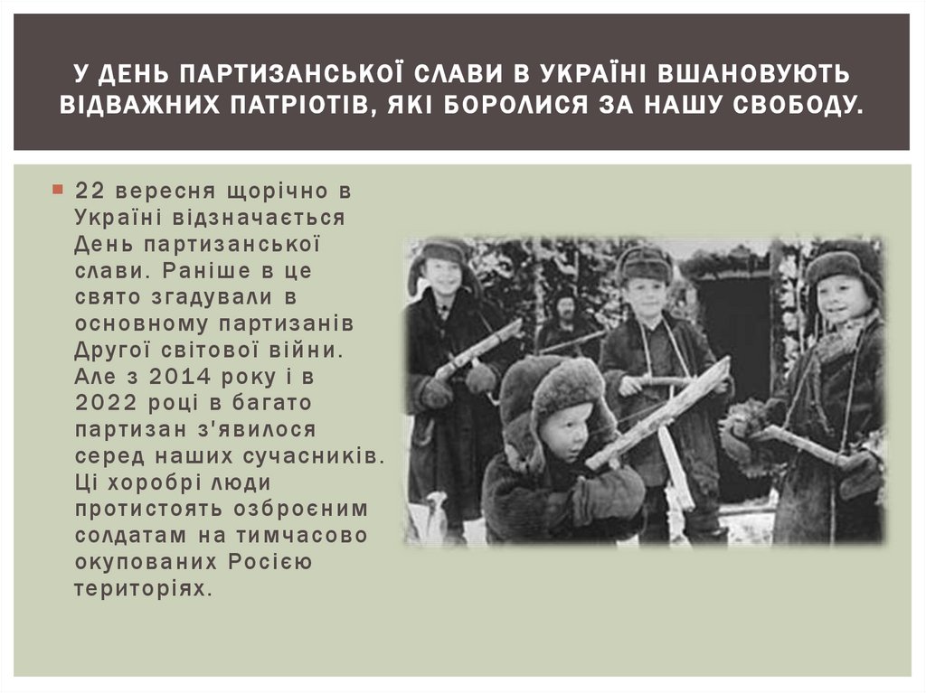 У Д Е Н Ь П А Р ТИЗАН С ЬКОЇ С Л А ВИ В У КРА Ї Н І В Ш А Н ОВУЮТЬВ І Д ВАЖН ИХ П АТ РІ ОТІВ , Я К І Б О Р ОЛ ИСЯ З А Н А Ш У С В ОБ ОДУ.