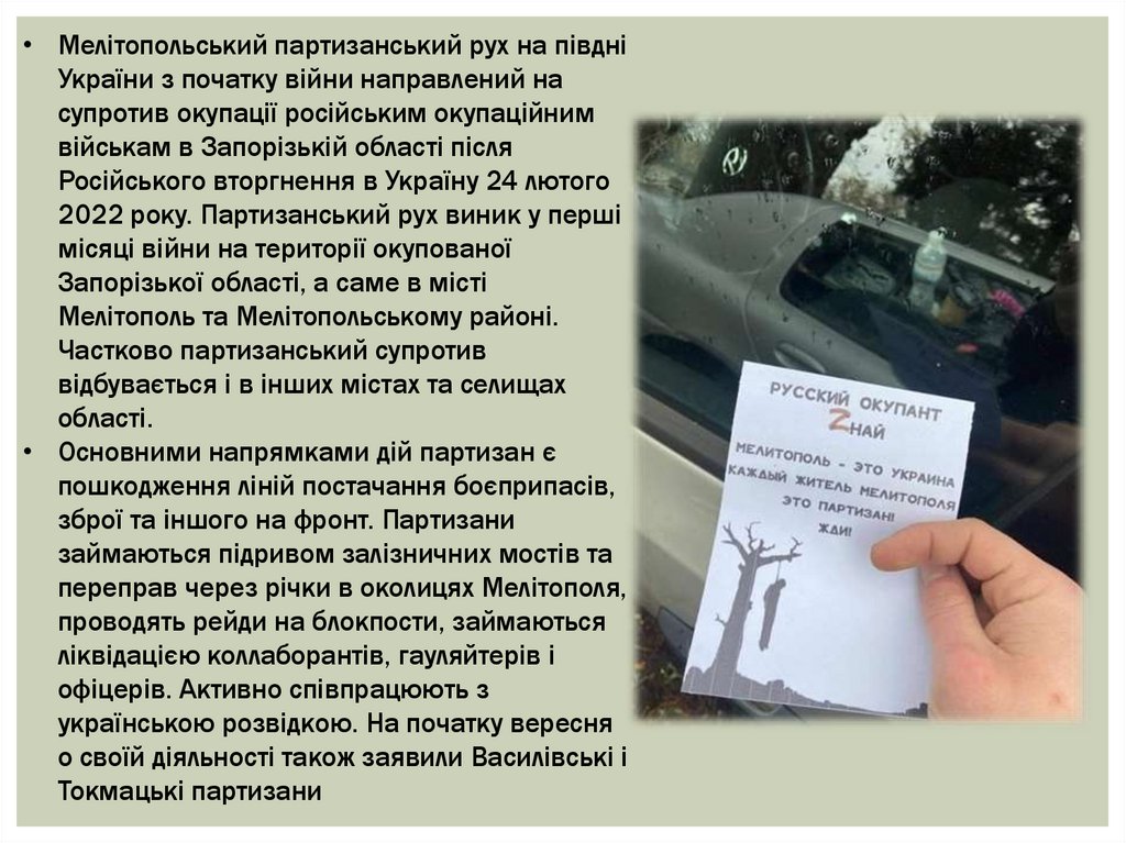 • Мелітопольський партизанський рух на півдніУкраїни з початку війни направлений на