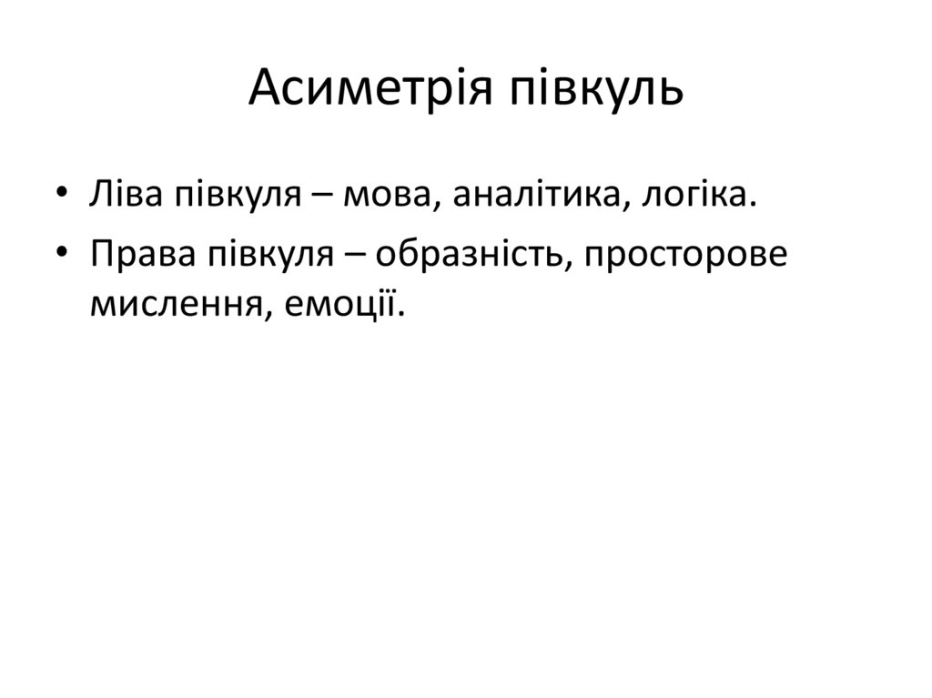 Асиметрія півкуль• Ліва півкуля – мова, аналітика, логіка.