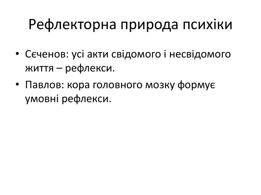 Рефлекторна природа психіки• Сєченов: усі акти свідомого і несвідомого