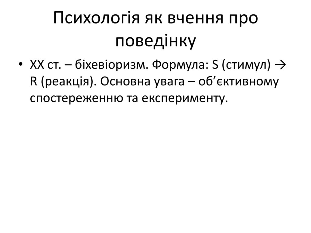 • XX ст. – біхевіоризм. Формула: S (стимул) →