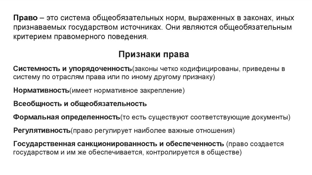 Право – это система общеобязательных норм, выраженных в законах, иныхпризнаваемых государством источниках. Они являются общеобязательным