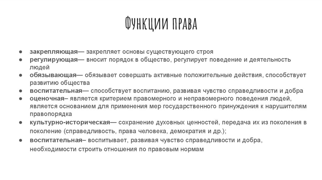 Функции правазакрепляющая— закрепляет основы существующего строя
