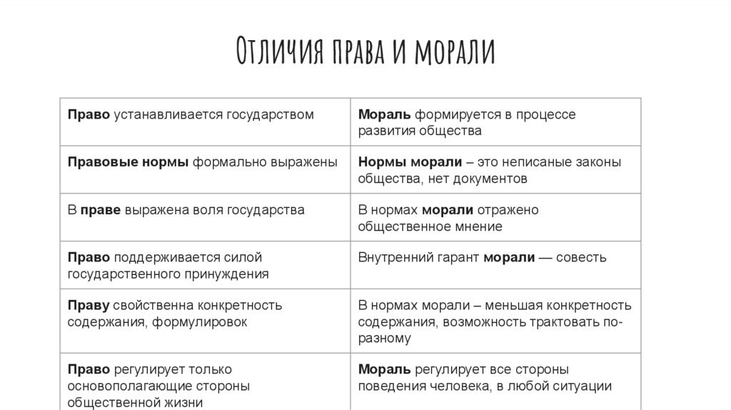 Отличия права и моралиПраво устанавливается государством