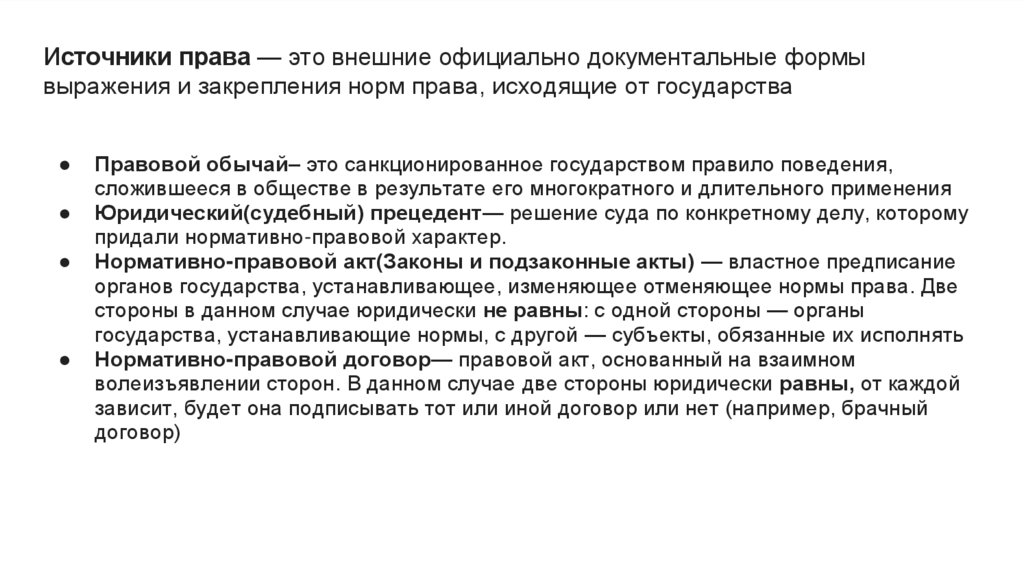 Источники права — это внешние официально документальные формывыражения и закрепления норм права, исходящие от государства