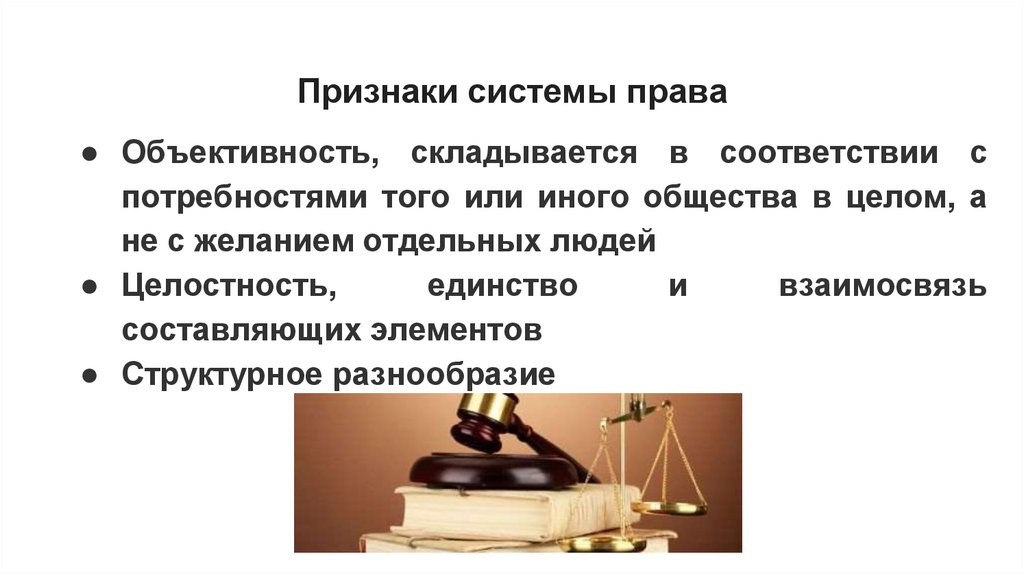 Признаки системы права● Объективность, складывается в соответствии с