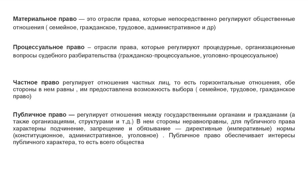 Материальное право — это отрасли права, которые непосредственно регулируют общественныеотношения ( семейное, гражданское, трудовое, административное и др)