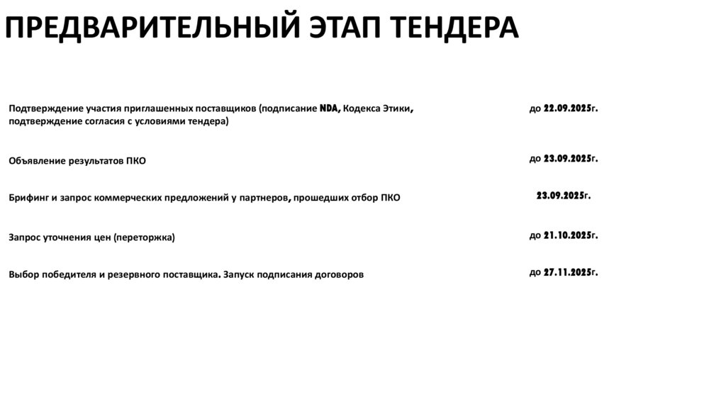 ПРЕДВАРИТЕЛЬНЫЙ ЭТАП ТЕНДЕРАПодтверждение участия приглашенных поставщиков (подписание NDA, Кодекса Этики,