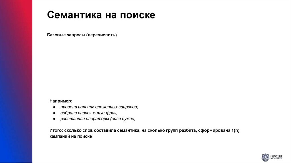 Итого: сколько слов составила семантика, на сколько групп разбита, сформирована 1(n)