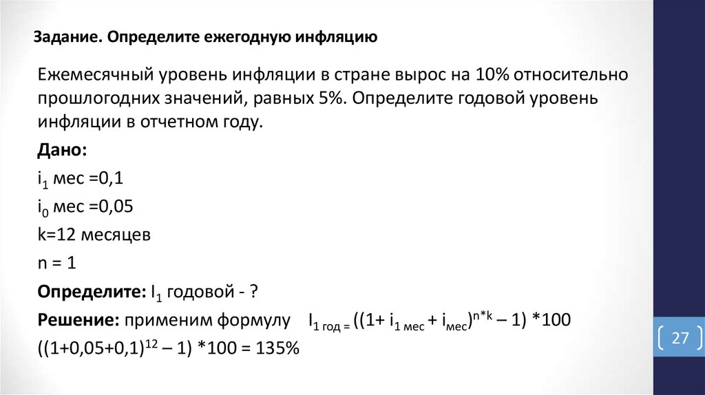 Задание. Определите ежегодную инфляциюЕжемесячный уровень инфляции в стране вырос на 10% относительно
