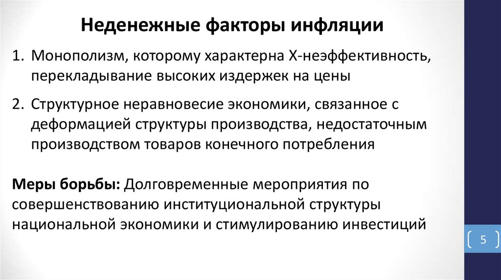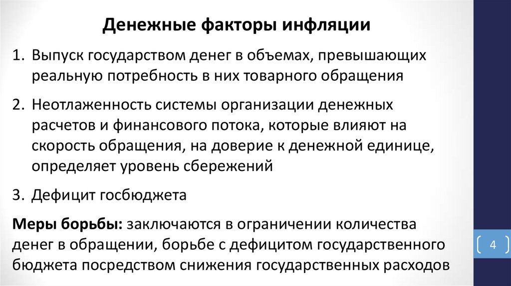 Монетарные:• рост номинального количества денег, превышающий рост производства при