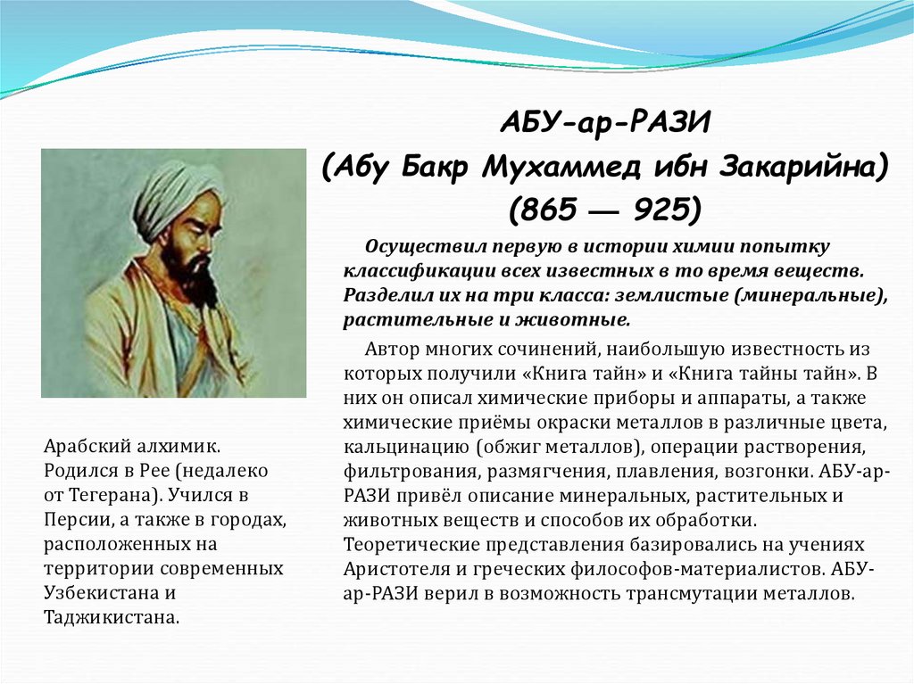 Аристотеля и греческих философов-материалистов. АБУар-РАЗИ верил в возможность трансмутации металлов.
