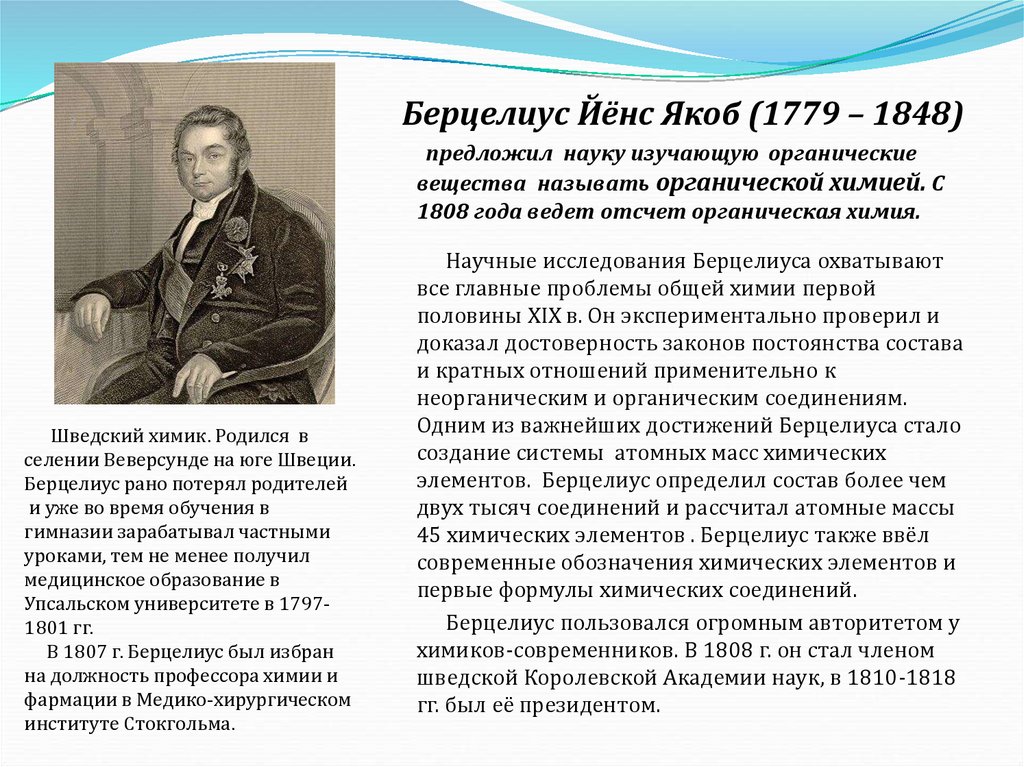 Берцелиус Йёнс Якоб (1779 – 1848)предложил науку изучающую органические