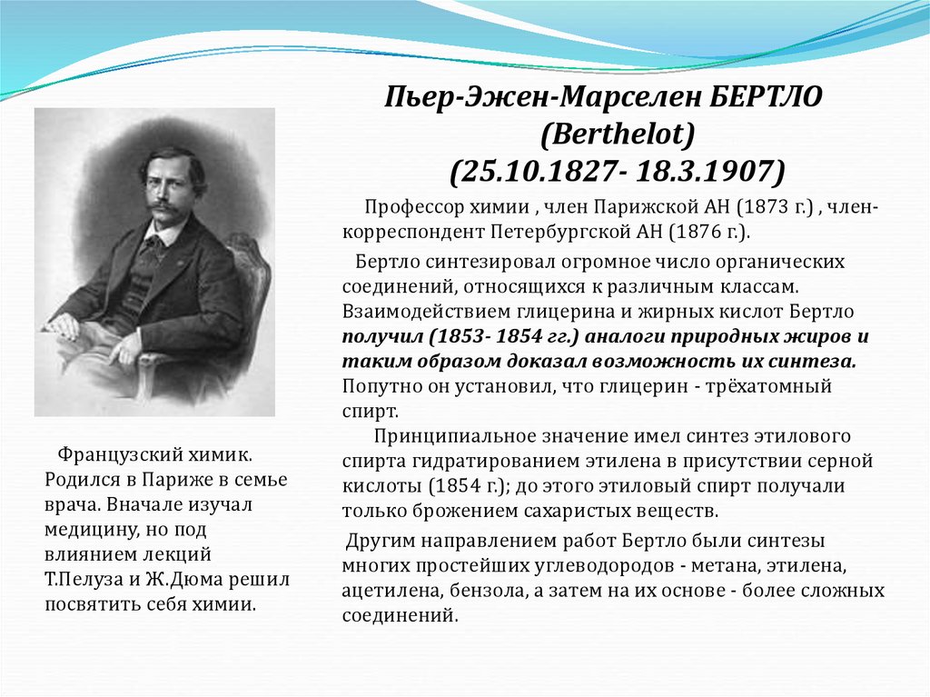 кислоты (1854 г.); до этого этиловый спирт получали