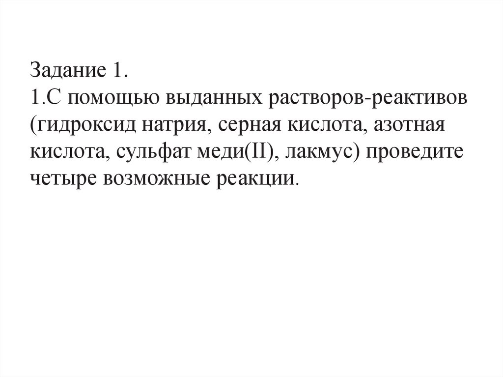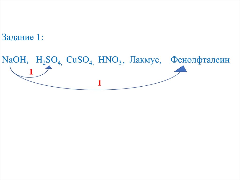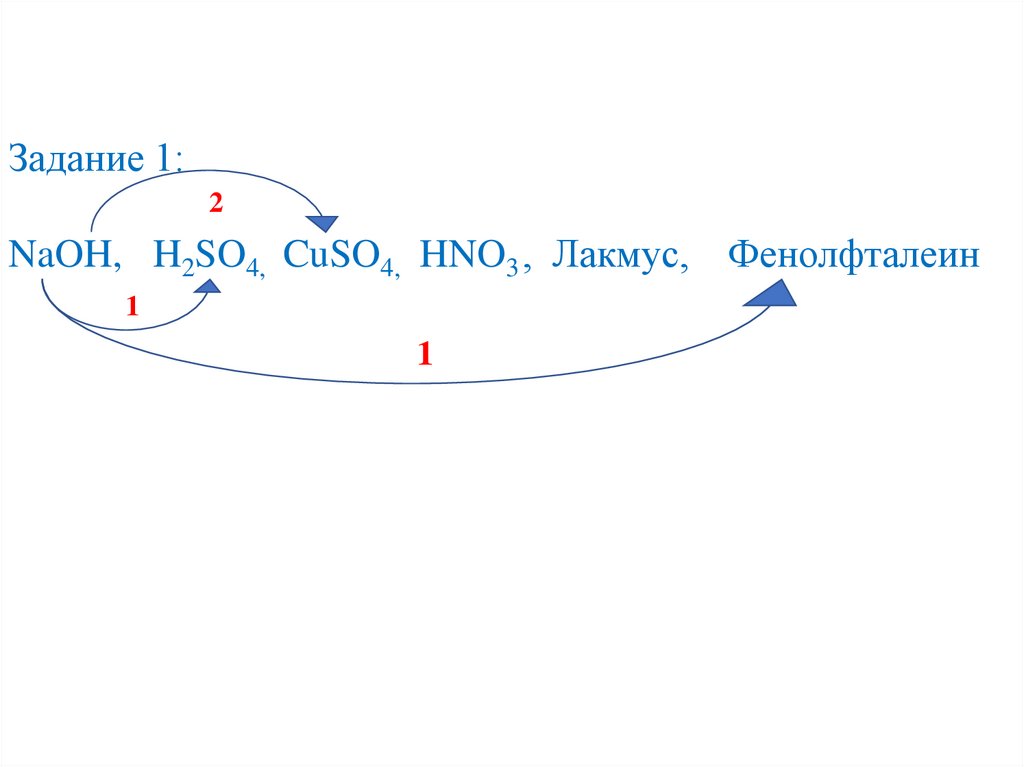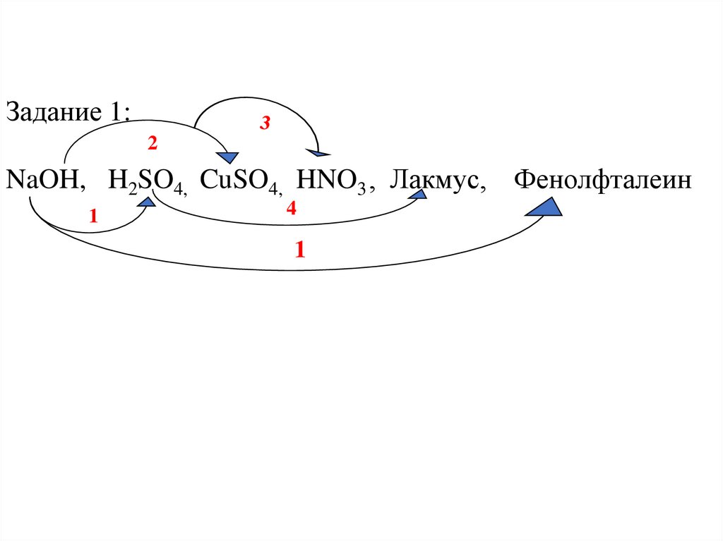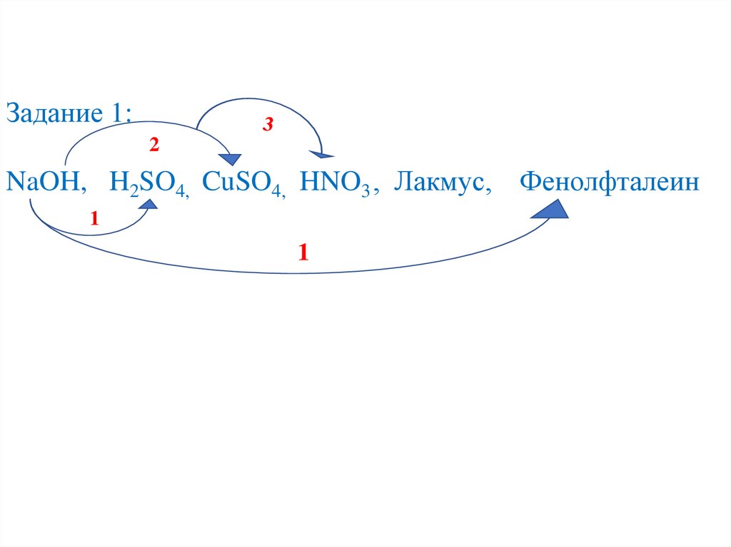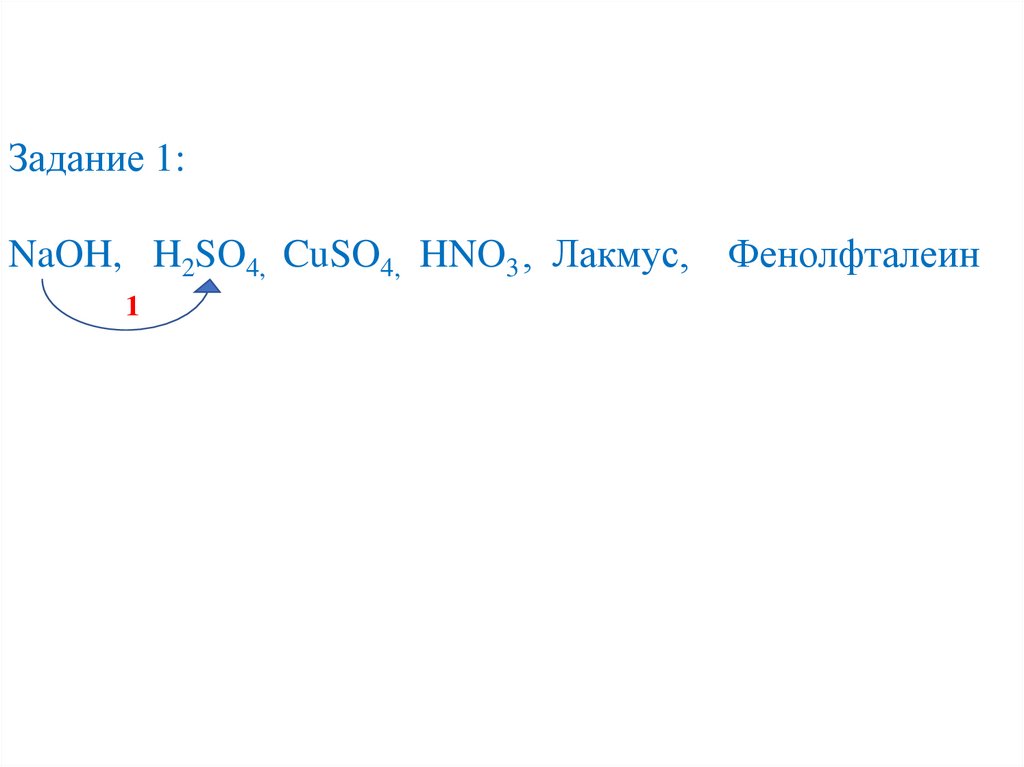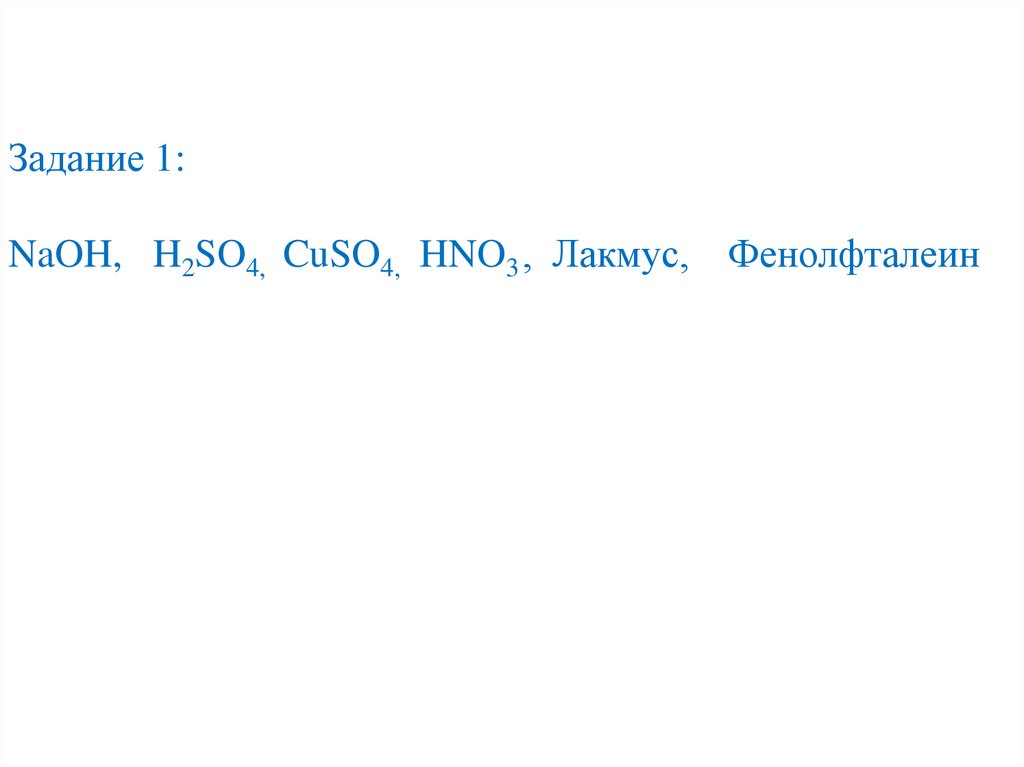 Задание 1:NaOH, H2SO4, CuSO4, HNO3 , Лакмус, Фенолфталеин