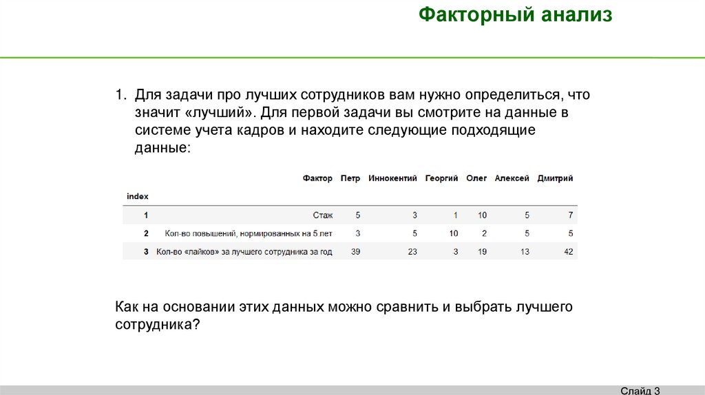 Факторный анализ1. Для задачи про лучших сотрудников вам нужно определиться, что