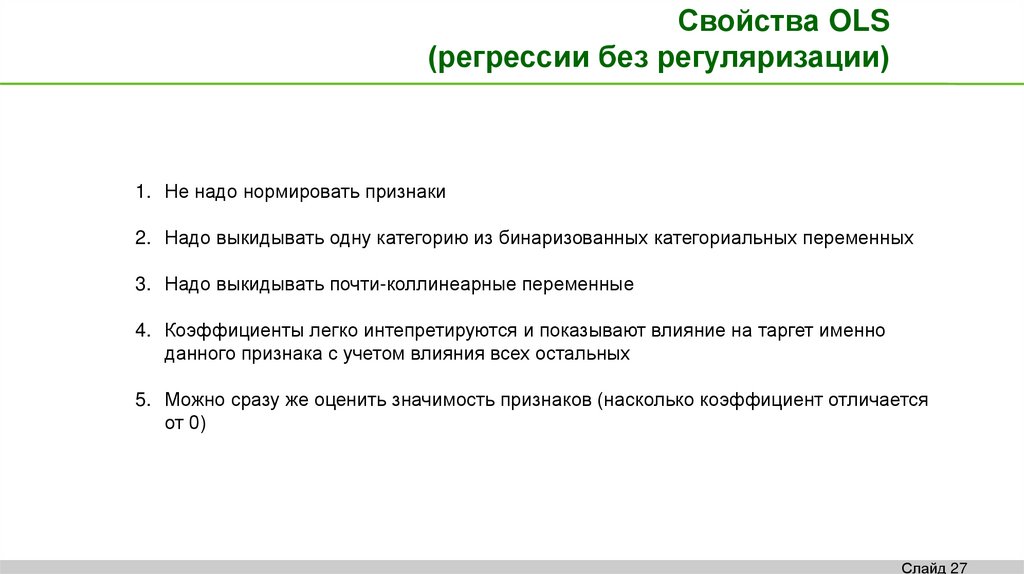 2. Надо выкидывать одну категорию из бинаризованных категориальных переменных
