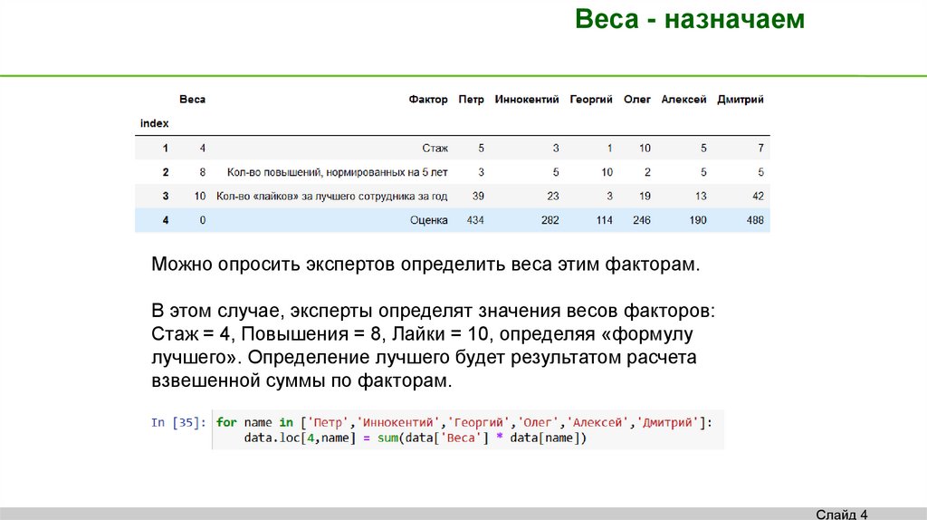 Стаж = 4, Повышения = 8, Лайки = 10, определяя «формулу