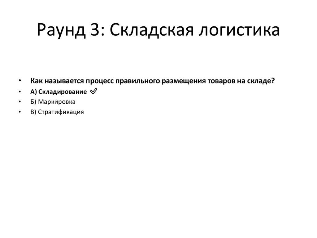 Раунд 3: Складская логистикаКак называется процесс правильного размещения товаров на складе?