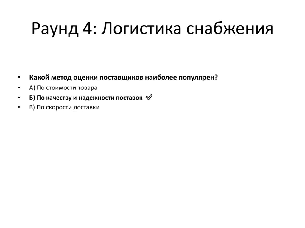 Раунд 4: Логистика снабженияКакой метод оценки поставщиков наиболее популярен?