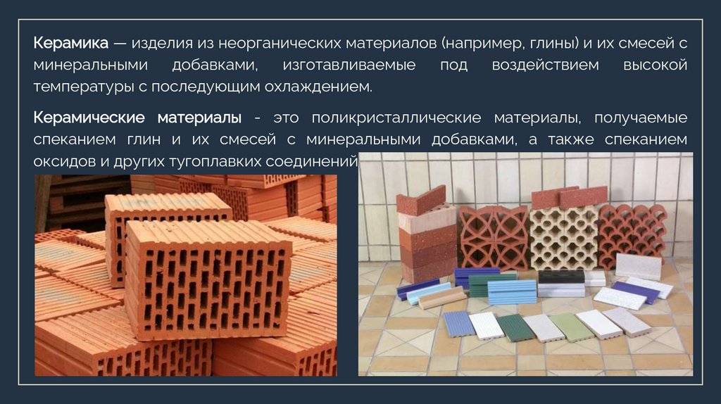 Керамика — изделия из неорганических материалов (например, глины) и их смесей сминеральными