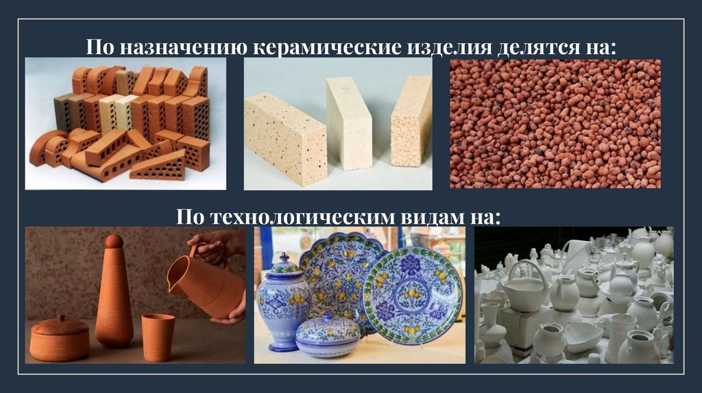 По назначению керамические изделия делятся на:По технологическим видам на: