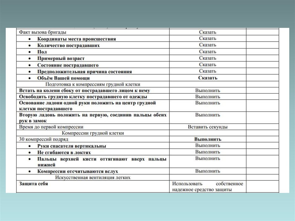 • Вызов реанимационной бригады.• Зафиксировать время.
